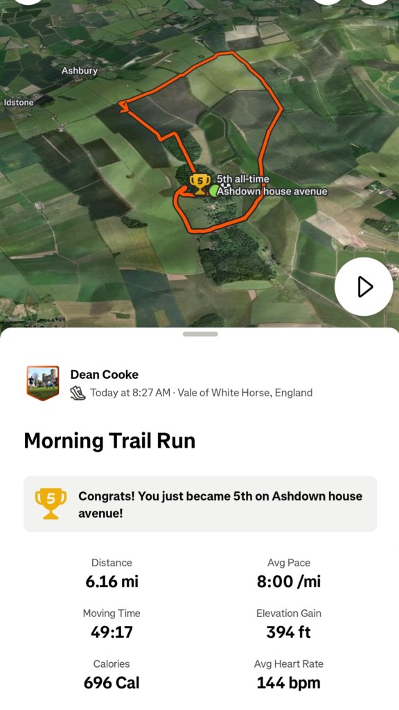 This week a slightly shorter variant on our wonderful Ashdown House 7 mile run. The run started in dark and dreary weather but ended in our first drenching of the season thanks to storm Amy. The route can be found below, try it or even better join is on a guided or group run for a seamless experience!